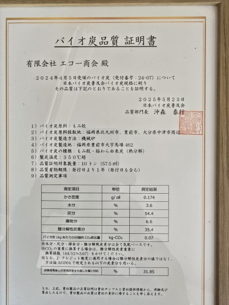 バイオ炭品質証明書2025年版更新
